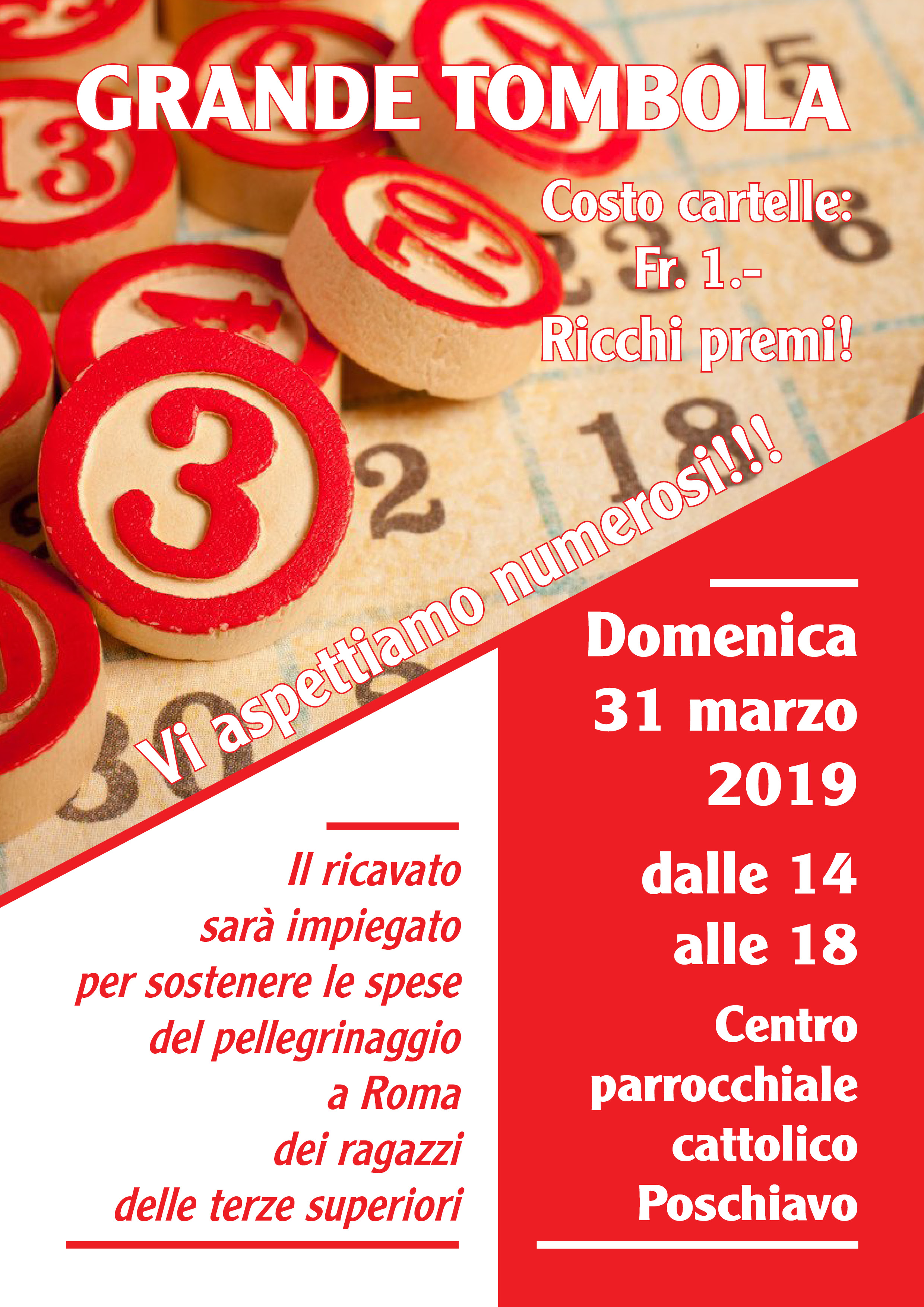 Dalle alle 14 alle 18, presso il Centro Cattolico Parrocchiale di Poschiavo, la Grande Tombola a favore del pellegrinaggio a Roma dei ragazzi delle terze superiori.