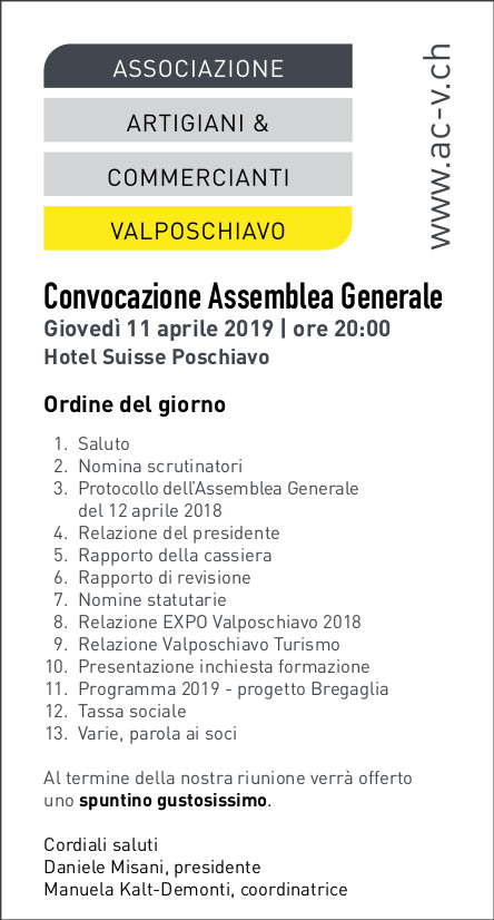 Senza categoria Assemblea generale ACV Giovedì 11 aprile Di Associazione Artigiani e Commercianti Valposchiavo - 3 Aprile 2019 0 124