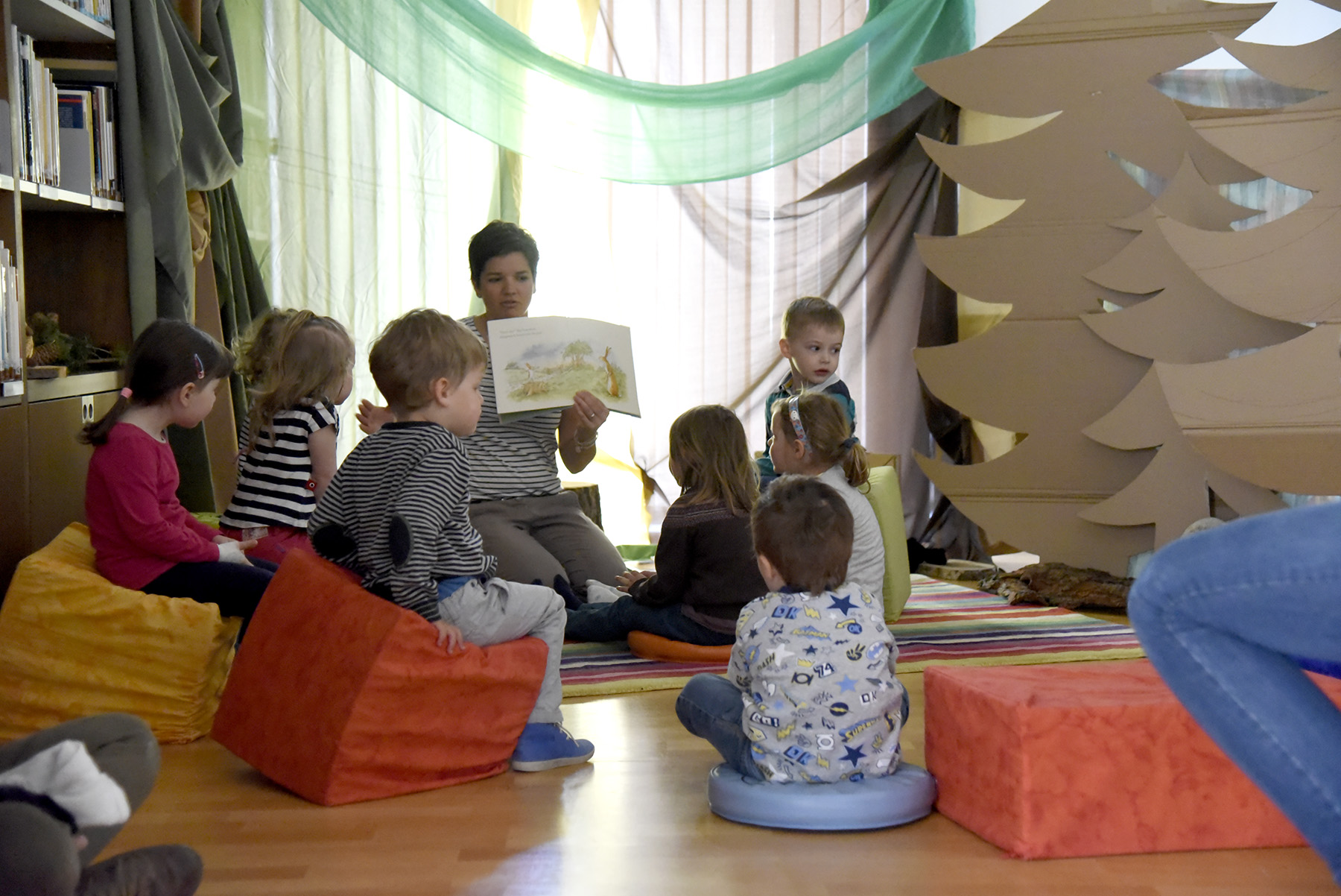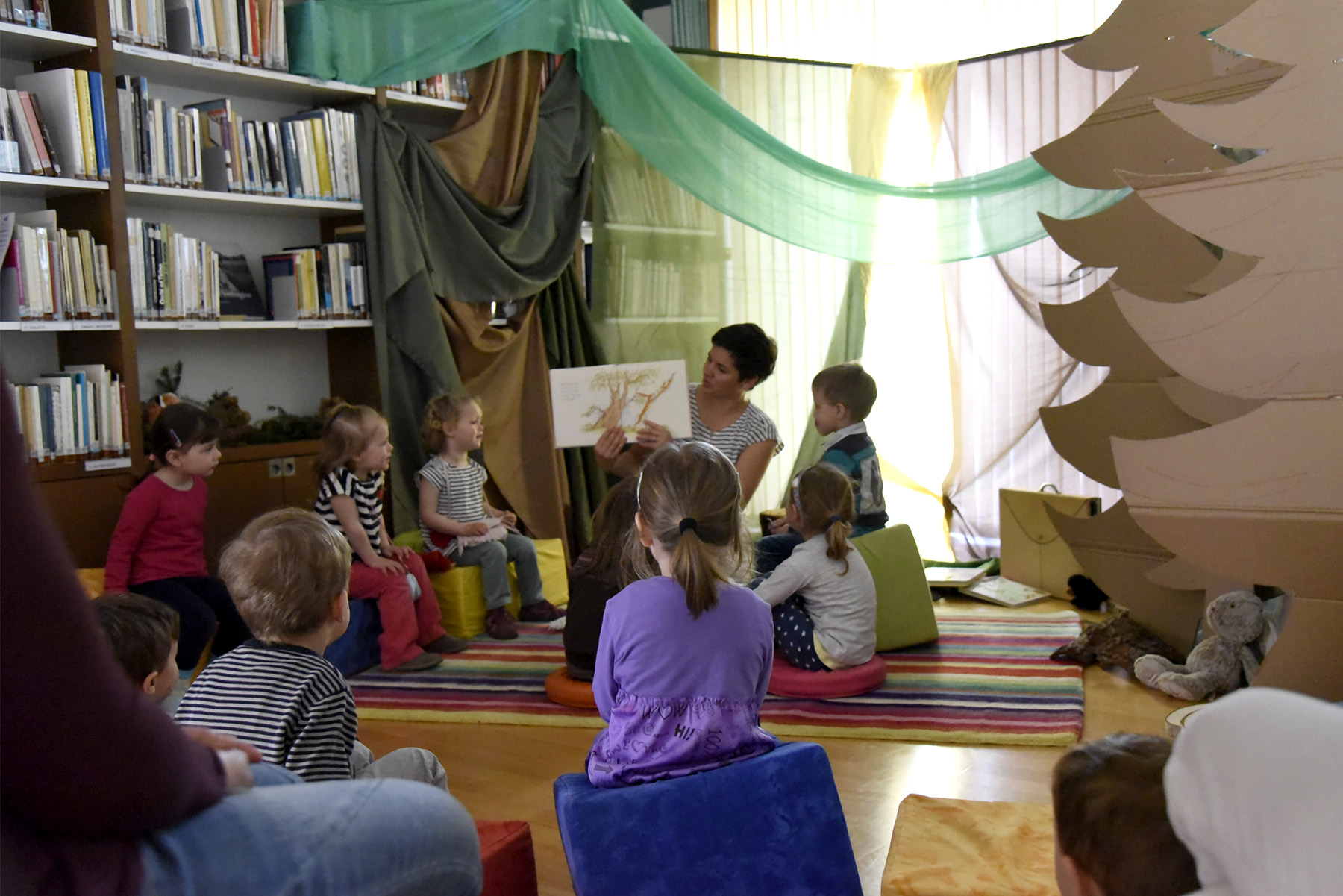 Un appuntamento al quale la biblio.ludoteca La Sorgente ha aderito proponendo due momenti ben distinti. Ad aprire la giornata sono state le letture organizzate per i più piccoli (dai 0 ai 5 anni) con vicende legate al bosco e raccontate in tre postazioni diverse per dar modo di ascoltarne più di una in spazi debitamente decorati. Una cinquantina i bambini che non hanno voluto perdere questa occasione.