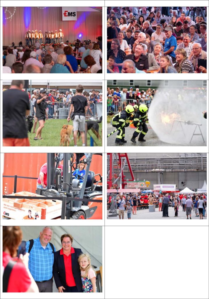 Al termine della manifestazione, all’insegna del motto «dalla regione per la regione», sulla piazza dei festeggiamenti è stato offerto ai visitatori un ricco e vario programma di intrattenimento con ospiti provenienti dai Grigioni: sotto il tendone da fiera, la 15enne Vanessa T., di Küblis, ha infervorato gli animi dei visitatori con la sua potente voce. Il gruppo folcloristico di Ilanz e dintorni, con i suoi costumi tradizionali dai colori vivaci e i suoi travolgenti balli popolari, ha fatto conoscere ai presenti un pezzo di tradizione grigionese. I danzatori di line dance della scuola di ballo Esti di Lenzerheide e la band di tamburi steel4ever di Davos hanno ampliato l’offerta musicale e animato a loro volta l’atmosfera. Non sono mancati nemmeno i VIP: la più autorevole cittadina grigionese, la presidentessa del Gran Consiglio del Cantone dei Grigioni, Tina Gartmann-Albin, il presidente del Governo dei Grigioni Jon Domenic Parolini e il Consigliere di Stato Mario Cavigelli, insieme al sindaco di Domat/Ems, Erich Kohler, si sono confrontati in una gara amichevole di «stima del peso» con l’ex Consigliere federale nonché presidente onorario di EMS Christoph Blocher, il presidente del CdA EMS Ulf Berg e la Consigliera nazionale grigionese nonché CEO del Gruppo EMS Magdalena Martullo. I due noti moderatori Sven Epiney e Annina Campell hanno condotto il ricco programma con tanto humor e simpatia.