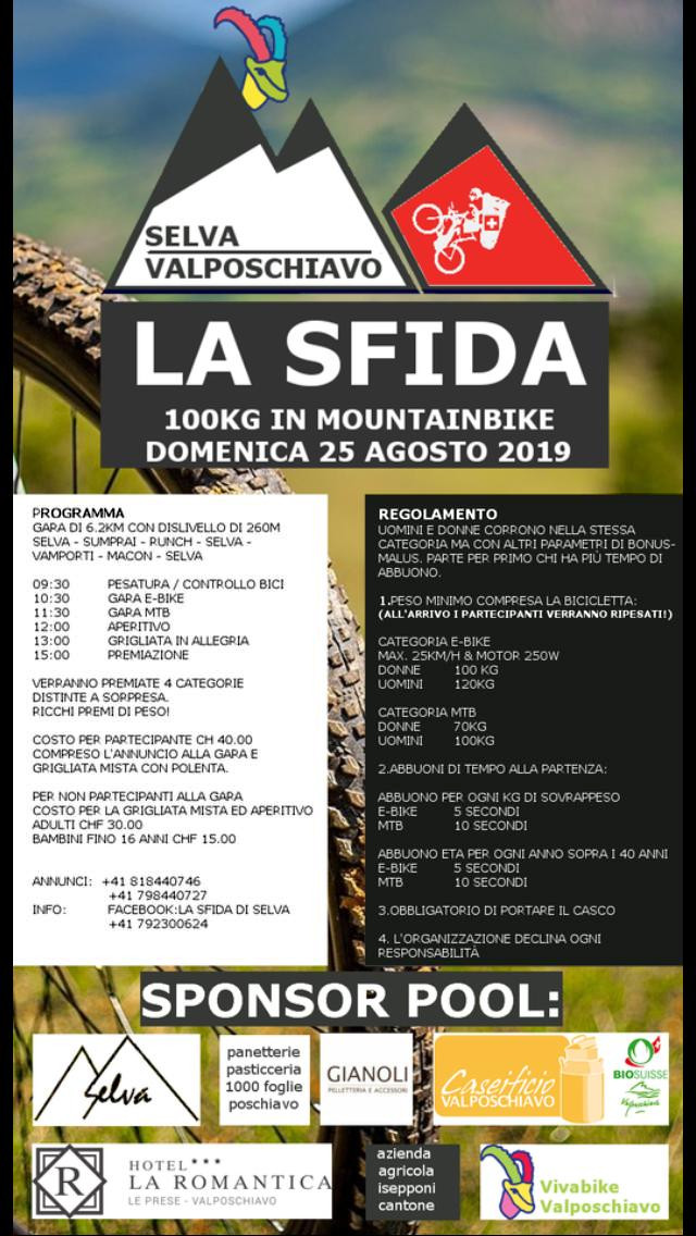 Il 25 agosto, in località Selva, andrà in scena la prima edizione della 100 kg in Mountainbike. Non sarà la consueta gara ciclistica dove i vincitori sono i soliti noti o i più allenati, ma una gara dove donne e uomini, dai più pesanti ai più leggeri, dai più giovani ai più vecchi, gareggeranno tutti nella stessa categoria e tutti avranno le stesse possibilità di vittoria. Per non favorire chi ha più ”motorizzazione” la gara sarà divisa in due: bici muscolari ed e-bike. Il meccanismo di gara è studiato appositamente per far partire tutti con le stesse chance, grazie a ”zavorre” e bonus sul cronometro.