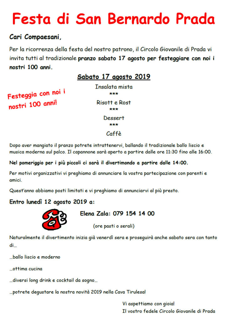 A partire dalle 11.30, il tradizionale pranzo e festa di San Bernardo a Prada.