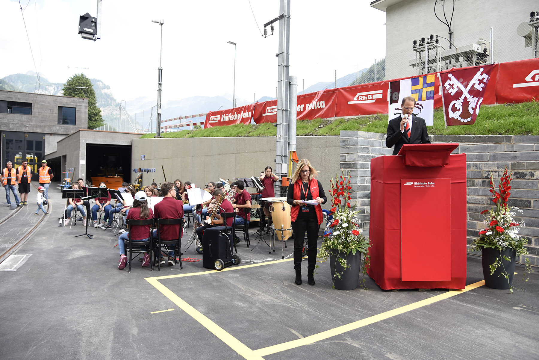 Poco prima dell’ora di pranzo i discorsi ufficiali da parte delle autorità hanno dato avvio all’inaugurazione. Dopo un saluto iniziale da parte di Ivonne Dünser, addetta ai media, il presidente del Consiglio di amministrazione Stefan Engler si è soffermato sul ruolo della stazione di Poschiavo quale importante tassello della rete ferroviaria della FR, specie per quanto riguarda il Bernina Express. Con questi importanti lavori di ampliamento e rifacimento la FR conferma il proprio interesse per la linea del Bernina, e quindi anche per la valle. Da parte sua il Podestà Giovanni Jochum, dopo aver ringraziato i presenti, ha voluto ricordare i fondatori della Ferrovia del Bernina, senza i quali, oggi non avremmo potuto festeggiare la nuova stazione.