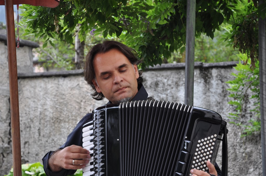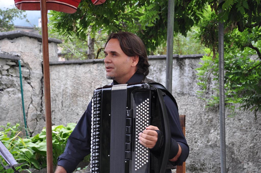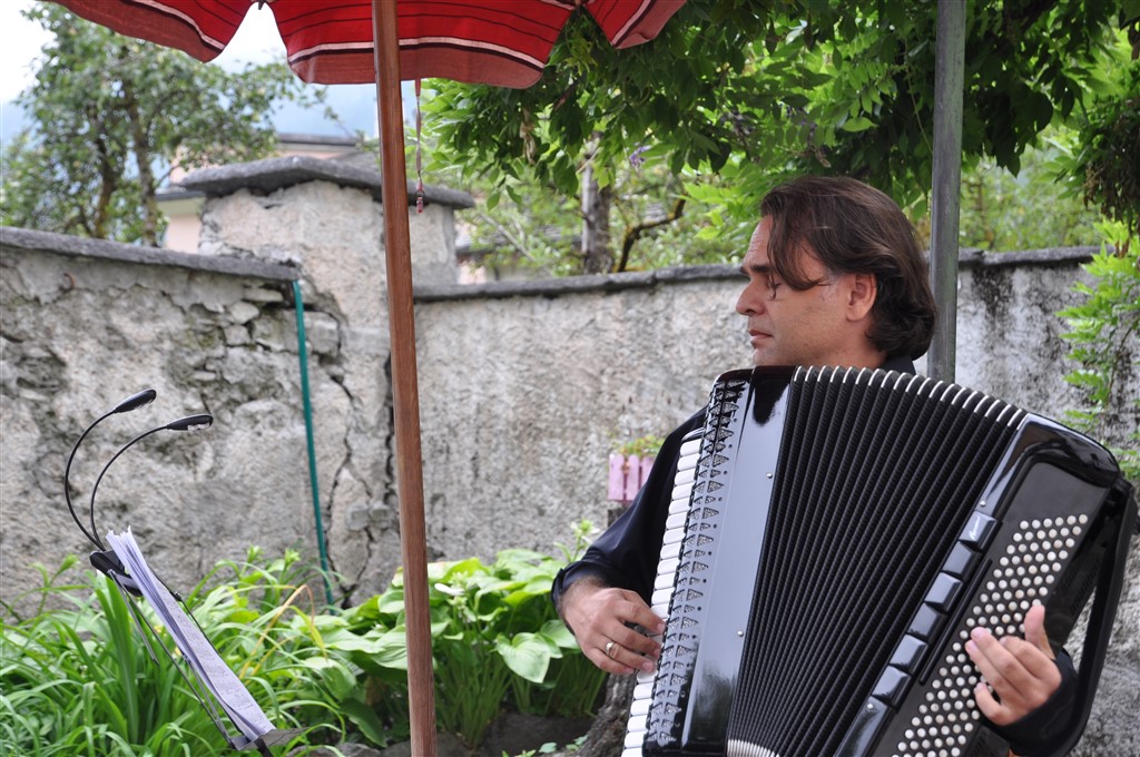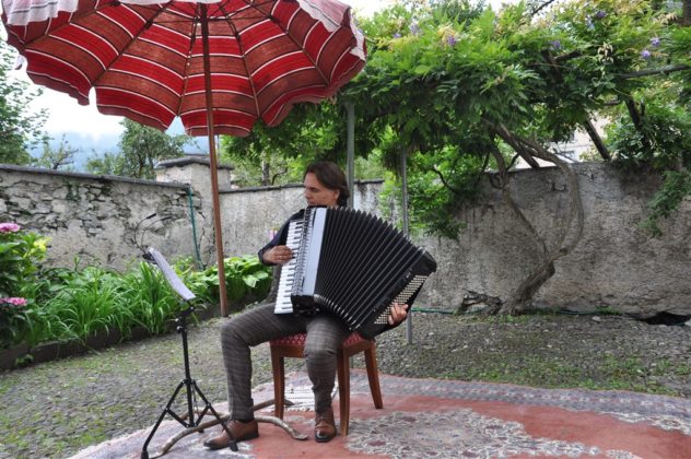 Dopodichè ha fatto la sua entrata Nermin Tulic, esperto fisarmonicista di origini balcaniche. Proprio quest’anno, il musicista ha inciso il suo primo album da solista, ‘’Cafe de l’Amour’’ , nel quale presenta canzoni d’amore da tutto il mondo. Canzoni d’amore che ha portato fino al giardino di casa Gay, incantando i presenti. Il pubblico si è fatto trascinare dal ritmo dei tanghi di Astor Piazzolla passando poi ad ascoltare musiche balcaniche, pezzi come la colonna sonora de Il Padrino e ha pure potuto apprezzare alcune composizioni dell’artista stesso. Sembrava ballasse, Tulic, insieme alla sua fisarmonica. Il tempo, come già accennato, è stato minaccioso fino all’ultimo secondo, creando però cosi un’atmosfera malinconica e romantica, perfetta per accompagnare i suoni di altri tempi che la fisarmonica sa regalare.