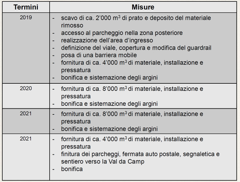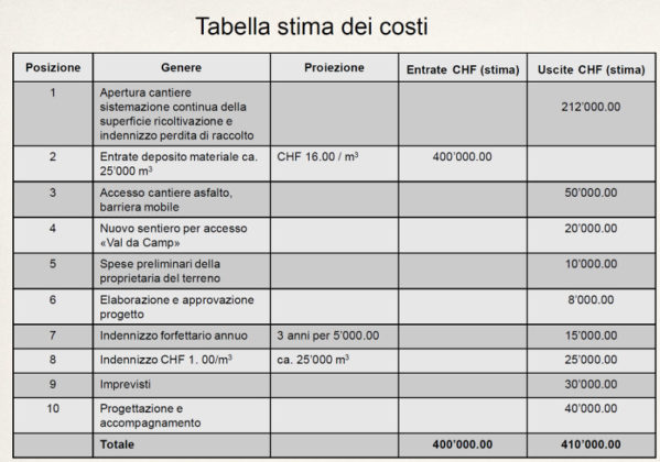 Il Consiglio comunale ha valutato che, durante l’estate, e anche in certi periodi invernali, il parcheggio di Sfazù, usato dai frequentatori della Val da Camp, si è rilevato a più riprese troppo piccolo. “L’ampliamento del parcheggio a Sfazù – è stato notato da responsabile del Dipartimento del turismo Orlando Lardi – risulta difficile per vari motivi, tra l’altro ambientali e di sicurezza”. I 400’000 CHF verranno deliberati nel corso dei prossimi 2-3 anni, mentre i costi per la realizzazione del posteggio, che avverrà in tre tappe, verranno coperti dalla tariffa per il deposito del materiale, fissata a CHF 16.00/m3.