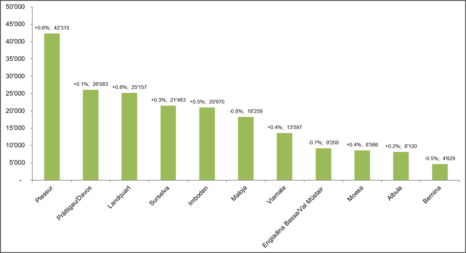 Quasi la metà dell’aumento della popolazione registrato in termini assoluti nei Grigioni si registra nella regione Plessur; riguardando anche le regioni Landquart e Imboden, la crescita continua a concentrarsi soprattutto sulla parte settentrionale del Cantone. Ma anche le regioni Viamala e Moesa hanno fatto registrare un aumento del numero di abitanti leggermente superiore alla media, mentre l’Engadina Alta e l’Engadina Bassa nonché la regione Bernina hanno visto una riduzione del numero dei propri abitanti.