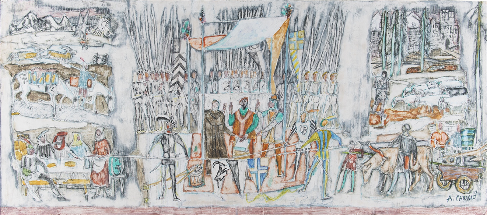 Oltre a concludere i lavori di sistemazione è stato possibile realizzare un’ulteriore valorizzazione dell’edificio del Gran Consiglio. Su proposta del granconsigliere Bruno Claus, il Cantone dei Grigioni ha colto l’opportunità di acquistare una bozza elaborata del murale di Alois Carigiet presente nell’edificio del Gran Consiglio “Der Zusammenschluss der Drei Bünde, 1959”. Alois Carigiet (1902–1985) è tra gli artisti più noti e popolari dei Grigioni. Oltre alle sue nature morte, alle vedute di villaggi e ai motivi figurativi, nei murali per committenti pubblici e privati egli ha trovato un compito artistico che lo ha tenuto occupato per lunghe fasi della sua vita. L’esempio più eminente è costituito dall’enorme murale per l’edificio del Gran Consiglio del Cantone dei Grigioni, che misura 6 x 14 metri ed è stato completato nel 1961: esso presenta diversi eventi storici accostati quali scene singole e uniti a livello formale. In questo murale Alois Carigiet ha trovato una convincente soluzione contemporanea per rappresentare la storia dei Grigioni. Attraverso l’acquisto e la presentazione della bozza nelle immediate vicinanze del murale all’interno dell’edificio del Gran Consiglio viene sottolineata l’importanza artistica di quest’opera e un importante documento della sua genesi viene reso accessibile al pubblico.