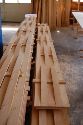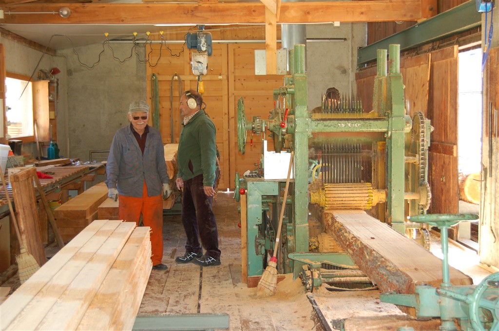 Esatto, la caratteristica principale dell’edificio è proprio il suo intreccio di tavole di legno ricavate dagli innumerevoli larici sradicati dalla recente tempesta. Le piante sono state scelte e segate da Bernardo Tuena, grande conoscitore del legname della nostra regione. Nella fattispecie si tratta di legno rigatino, ossia di tronchi cresciuti lentamente in altitudine e quindi con venature molto ravvicinate: un legno molto compatto e pressoché privo di nodi.  Le tavole, di 10 cm di larghezza e 22 mm di spessore, intrecciate con elementi orizzontali, sono state composte in elementi prefabbricati fissati poi alla struttura. Mi piace sottolineare che questo legno viene dalla zona Mürasc, sopra i monti di Torn, proprio dove ha la casa Giampietro Crameri, per decenni l’anima del restauro e della gestione del Mulino Aino accanto a cui sorge il nuovo edificio.
