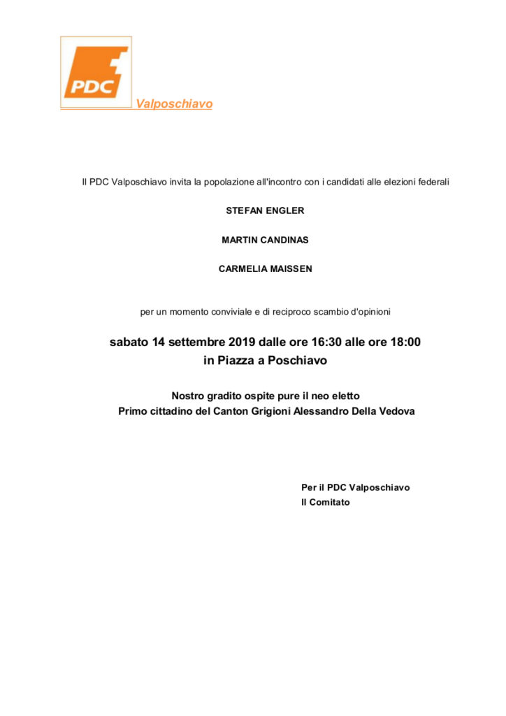 Senza categoria Incontro con candidati elezioni federali Sabato 14 settembre Di Partito Democratico Cristiano Valposchiavo - 6 Settembre 2019 0 123