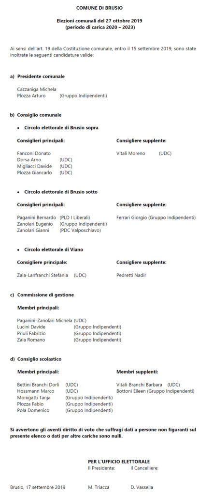 Senza categoria Elenco candidati elezioni comunali periodo 2020-2023 Di Comune di Brusio - 17 Settembre 2019 0 565