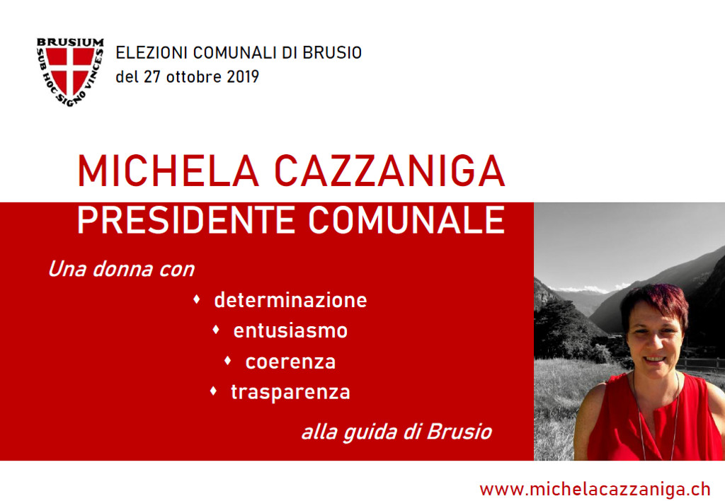 Se la popolazione vorrà avere fiducia in me, potrò rappresentare in questo momento un cambiamento e, se la gente di Brusio lo riterrà opportuno, potrò anche garantire continuità in futuro. I problemi e le sfide sono molti. Desidero creare con il nuovo consiglio comunale, uscenti e nuovi, un team affiatato e coinvolto per affrontare uniti il futuro di Brusio. Da parte mia la promessa che, se eletta, mi impegnerò con entusiasmo e al 100% in ogni sfida. Valuterò in modo oggettivo ogni situazione, mi impegnerò ad ascoltare e a comprendere le opinioni altrui, per trovare soluzioni giuste per il nostro Comune. Come finora, sarò determinata, coerente, imparziale e corretta verso tutti i cittadini. Da ultimo ma non per ultimo sarò trasparente verso il popolo di Brusio, affinché sia sempre coinvolto fin dall’inizio nei temi importanti che lo riguardano, perché Brusio è il suo popolo.
