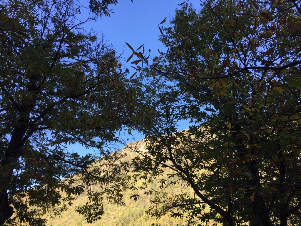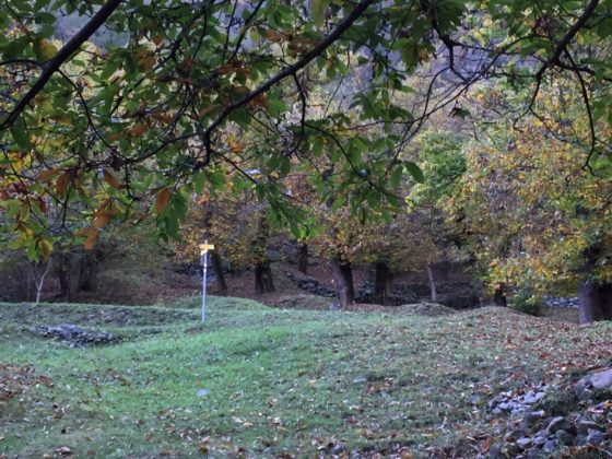 Era già in ombra Campocologno alle due di pomeriggio, ma il sole della montagna che lo sovrasta rifletteva una luce davvero particolare. Così appena saliti oltre la Chiesa scoprire le Selve è stata una grande sorpresa: passando dalla strada cantonale uno neanche lo immagina che appena lì sopra si aprono prati morbidi, spaziosi, che si allargano e ti allargano lo sguardo verso il fondovalle, fino alle case di Madonna. E la Selva castanile sabato pareva proprio un bosco fatato.