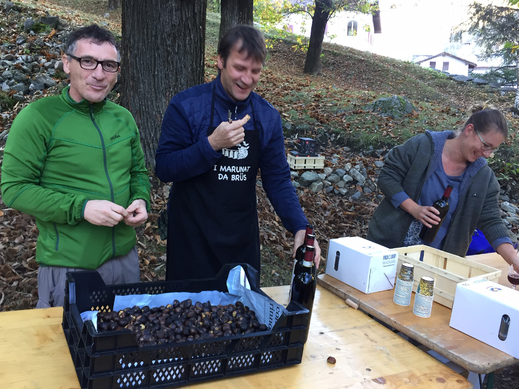 E’ imponente questa pianta, sembra nata per proteggerti. E la castagna regina di queste selve è la Tudiscia, un po’ più piccola dei marroni ma tanto più saporita. Ne abbiamo avuto la prova direttamente sul posto, dopo che due Marunat ci hanno cucinato sul fuoco tudiscie e castagne, sfidandoci a riconoscere il sapore. E che sapore: sapore di Terra Nostra. Grazie.