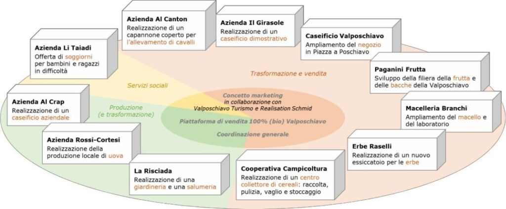 L’obiettivo principale del “concetto di marketing”, coordinato da Valposchiavo Turismo, è l’aumento del valore aggiunto locale generato dalle materie prime e dai prodotti trasformati in valle tramite la vendita in loco (alberghi, privati), la vendita nella vicina Engadina (alberghi) e la vendita nel resto della Svizzera (alberghi, commercio all’ingrosso, privati). Un aumento della vendita in loco andrà stimolato con il turismo, che dovrà indurre il turista a spostarsi in Valposchiavo per trovare l’«originale», mentre i prodotti che vengono commercializzati fuori valle avranno una funzione subalterna di “ambasciatori” per la valle. Nel concetto di marketing rientra anche la proposta di Andi Schmid (Realisation Schmid), che prevede la messa a dimora in diversi luoghi pubblici della Valposchiavo di piante da frutto. I frutti potranno essere colti da chiunque, da qui il nome del progetto «fruttipertutti».