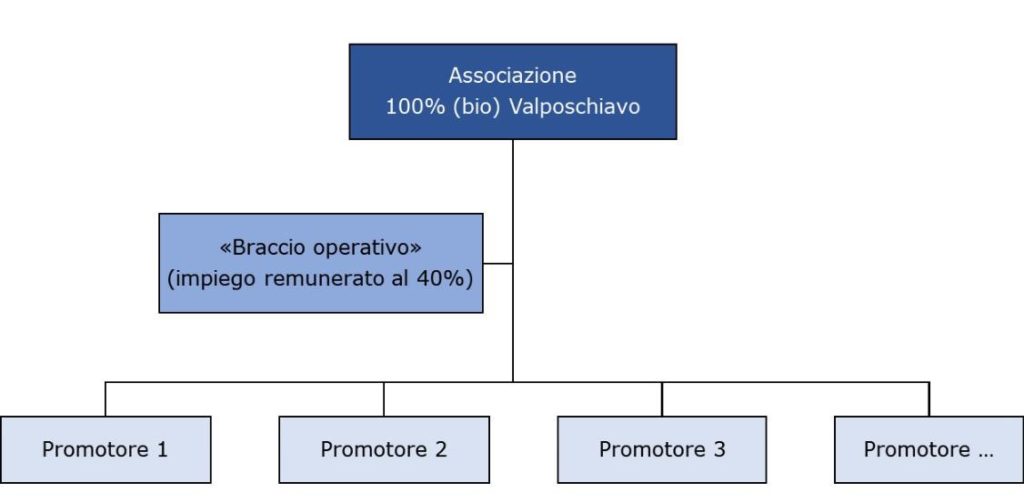 In quest’ultima tappa di realizzazione l’ente promotore del progetto «100% (Bio) Valposchiavo» è la Regione Bernina, che ha dato incarico a Daniele Raselli e Gianluca Giuliani della conduzione dei lavori di progettazione e gestione finanziaria. L’idea di base è che ciascun progetto realizzato nell’ambito dell’associazione mantello porti un valore aggiunto a tutta l’area di progetto, contribuendo al mosaico di offerte «100% (Bio) Valposchiavo». Tutti i progetti hanno inoltre lo scopo di mantenere la filiera corta e in loco (produzione – lavorazione – confezionamento – vendita). Il corposo documento inoltrato all’Ufficio federale dell’agricoltura per la richiesta dei contributi elenca i partner, che sono anche i membri fondatori dell’associazione, e i vari progetti che vedranno la luce nei prossimi anni.
