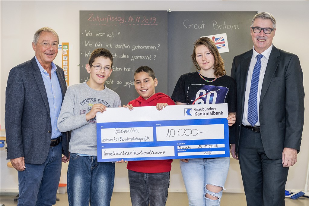Coira, 20 novembre 2019 – Per la dodicesima volta, la Banca Cantonale Grigione (BCG) ha condotto la sua iniziativa di Avvento a favore di un ente di pubblica utilità. I collaboratori della BCG hanno deciso di donare 10 000 franchi dal fondo GKB BEITRAGSFONDS al Zentrum für Sonderpädagogik GIUVAULTA (centro di pedagogia speciale) di Rothenbrunnen.