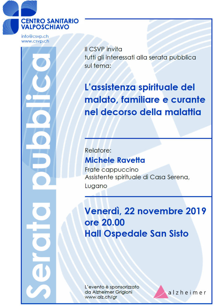 Alle 20.00, presso la Hall dell’Ospedale San Sisto, la serata pubblica ”L’assistenza spirituale del malato, familiare curante nel decorso della malattia” con relatore: Michele Ravetta, frate capuccino – Assistente spirituale di Casa Serena, Lugano.