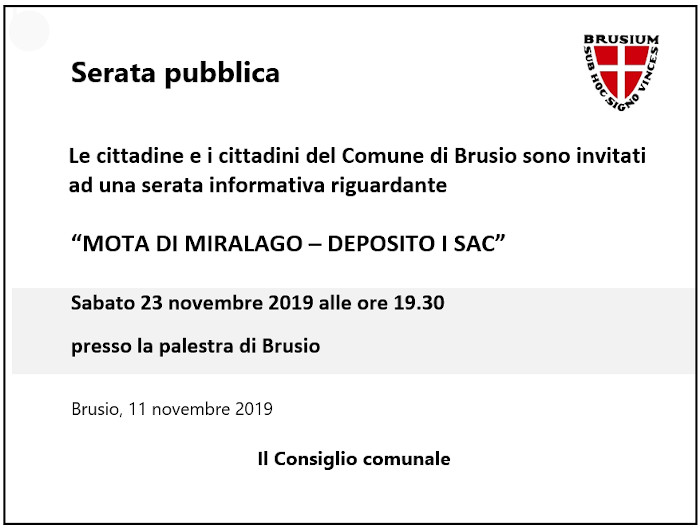Alle 19.30, presso la palestra di Brusio, la serata pubblica ”Mota di Miralago e deposito I Sac”.