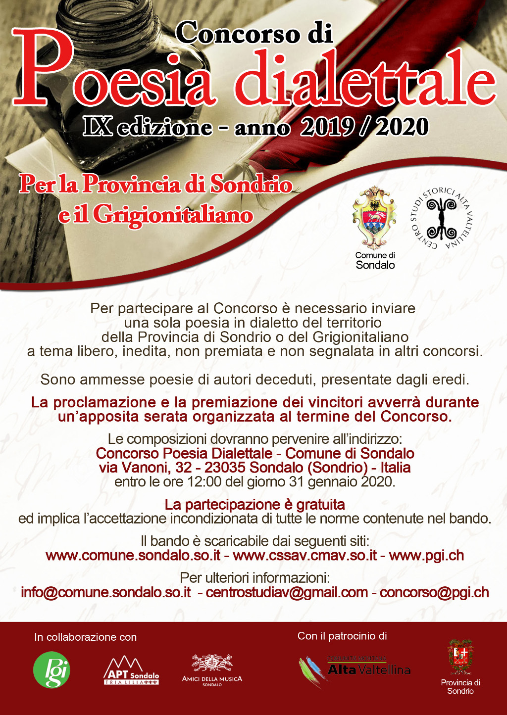 Le composizioni dovranno pervenire all’indirizzo: Concorso Poesia Dialettale – Comune di Sondalo, via Vanoni, 32 – 23035 Sondalo (Sondrio – Italia) entro il giorno 31 gennaio 2020, nel rispetto di quanto indicato dal bando. La partecipazione è gratuita.