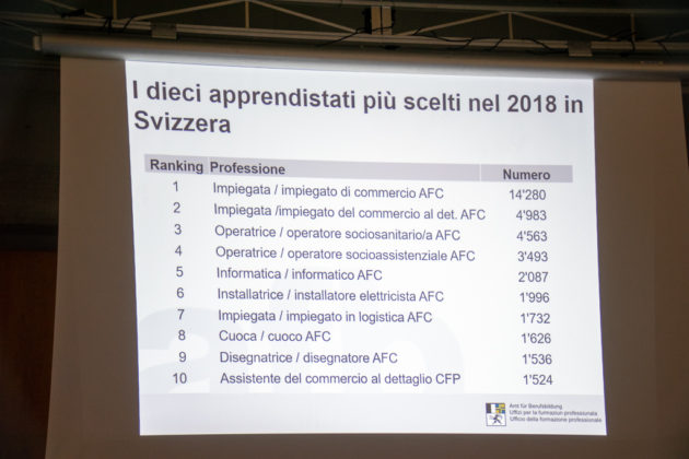 “Se adesso faccio solo l’apprendistato – ha chiesto retoricamente ai presenti Lorenzetto – avrò chance con la digitalizzazione?” Sicuramente: – è stata la risposta – l’uomo e il suo lavoro creativo continuano e continueranno ad avere un ruolo centrale e, in questo senso, la Svizzera continua a formare i migliori professionisti al mondo. L’altra domanda cruciale rivolta al pubblico è stata: Qual è la scelta migliore per orientarsi nel mondo delle professioni? “La vostra” – ha risposto l’Ispettore delle professioni, anticipando le argomentazioni emerse nella successiva tavola rotonda proposta dall’orientatore professionale Francesco Vassella. La scelta autonoma e consapevole dei ragazzi, inoltre, è stato aggiunto, è importante che venga sostenuta anche dai genitori.