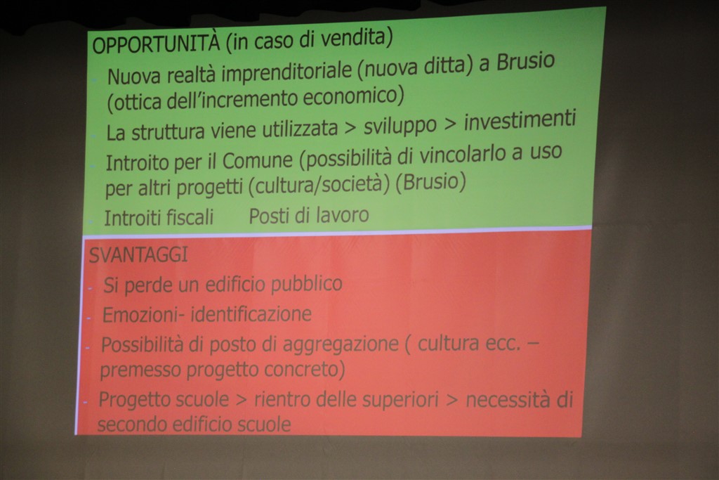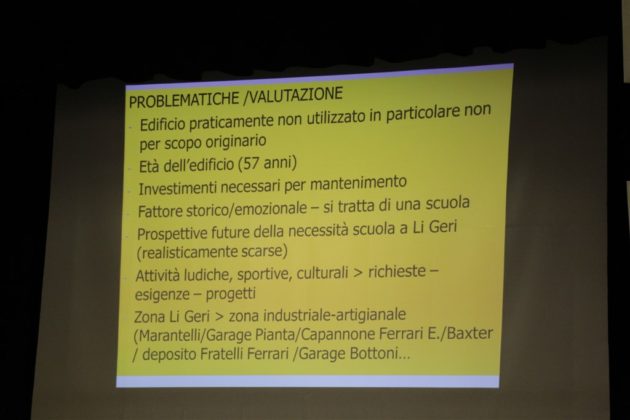 A questo punto il presidente dell’Assemblea comunale ha proiettato sul telo una serie di valutazioni sulle problematicità, le opportunità e gli svantaggi relativi all’immobile in oggetto: