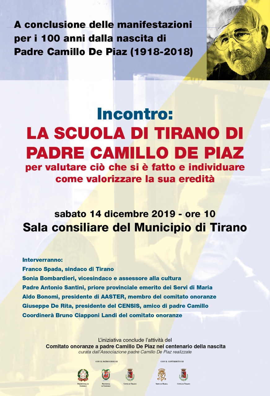 Sabato 14 dicembre 2019 alle ore 10, nella sala consiliare del Municipio di Tirano, a conclusione delle manifestazioni per i 100 anni dalla nascita di Padre Camillo De Piaz, si terrà l’incontro :“La scuola di Tirano di Padre Camillo De Piaz”, per una valutazione di quanto si è fatto per ricordarlo e per individuare come valorizzare la sua eredità.
