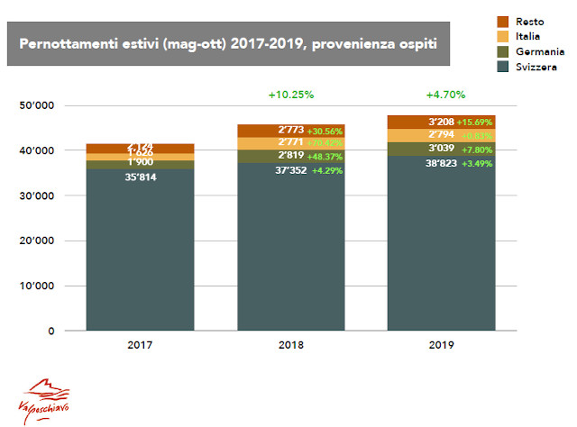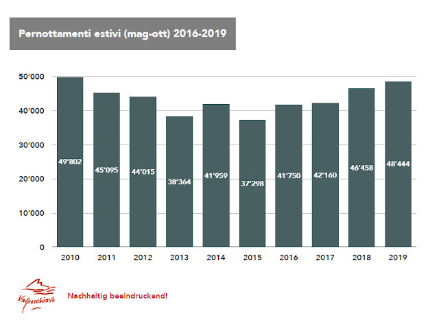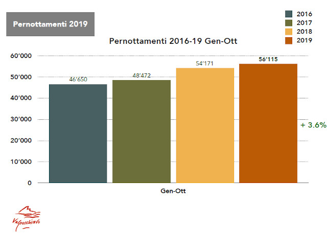 Valposchiavo Turismo ci ha da poco comunicato le cifre ufficiali sui pernottamenti della stagione 2019. I numeri negli ultimi 4 anni sono in continua crescita, grazie ad un trend che dal 2015 ha visto un incremento costante dei pernottamenti in valle. Fin qui il 2019 (gennaio/ottobre) ha fatto registrare un + 3,6% rispetto ai già ottimi numeri del 2018, grazie alla presenza, nelle strutture ricettive valposchiavine, di 56’115 ospiti (nel 2018 erano stati 54’171).