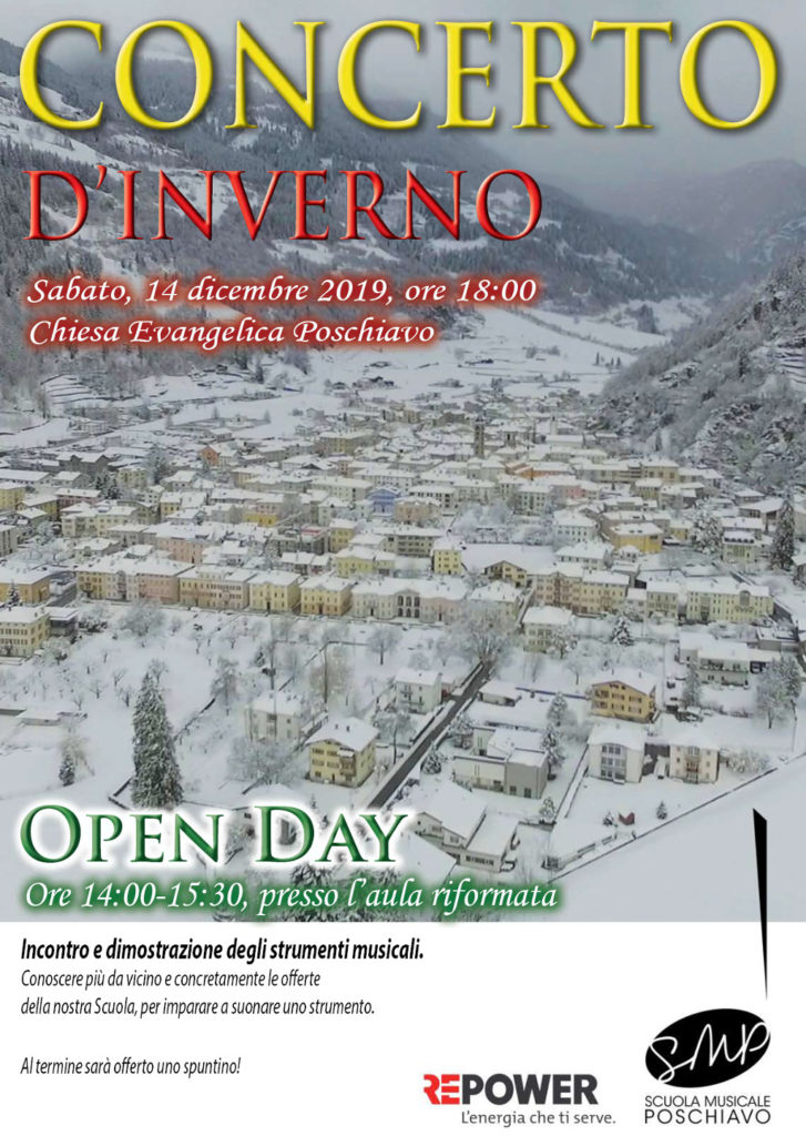 Dalle 14.00 alle 15.30, presso l’aula riformata di Poschiavo, Open Day della Scuola Musicale Poschiavo. Alle 18.00, presso la Chiesa Evangelica, il Concerto d’inverno.