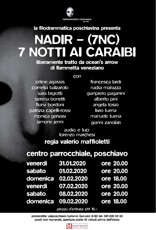 Oggi alle 18 appuntamento presso il Centro Parrocchiale di Poschiavo per assistere allo spettacolo della Filodrammatica Poschiavina: “Nadir – 7 notti ai Caraibi”.