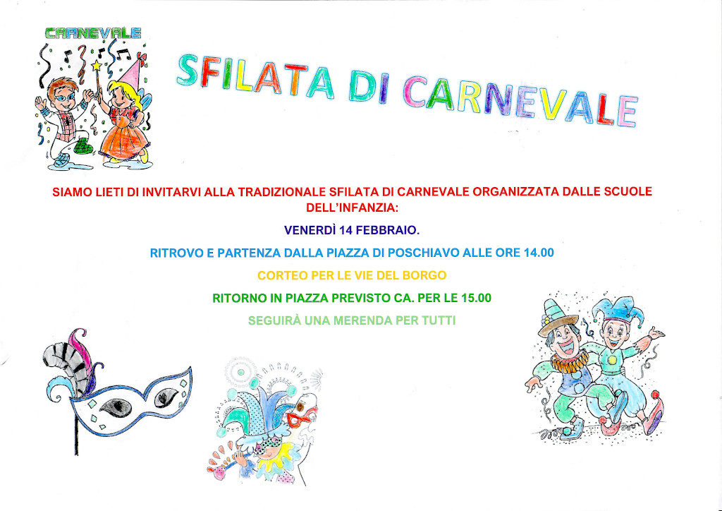 Dalle 14.00, partendo dalla piazza di Poschiavo, la tradizionale Sfilata di Carnevale delle scuole dell’infanzia.