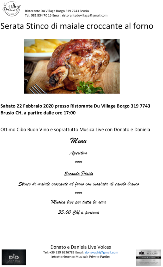 Dalle 17.00, presso il ristorante Du Village Borgo a Brusio, la serata Stinco di maiale croccante al forno.