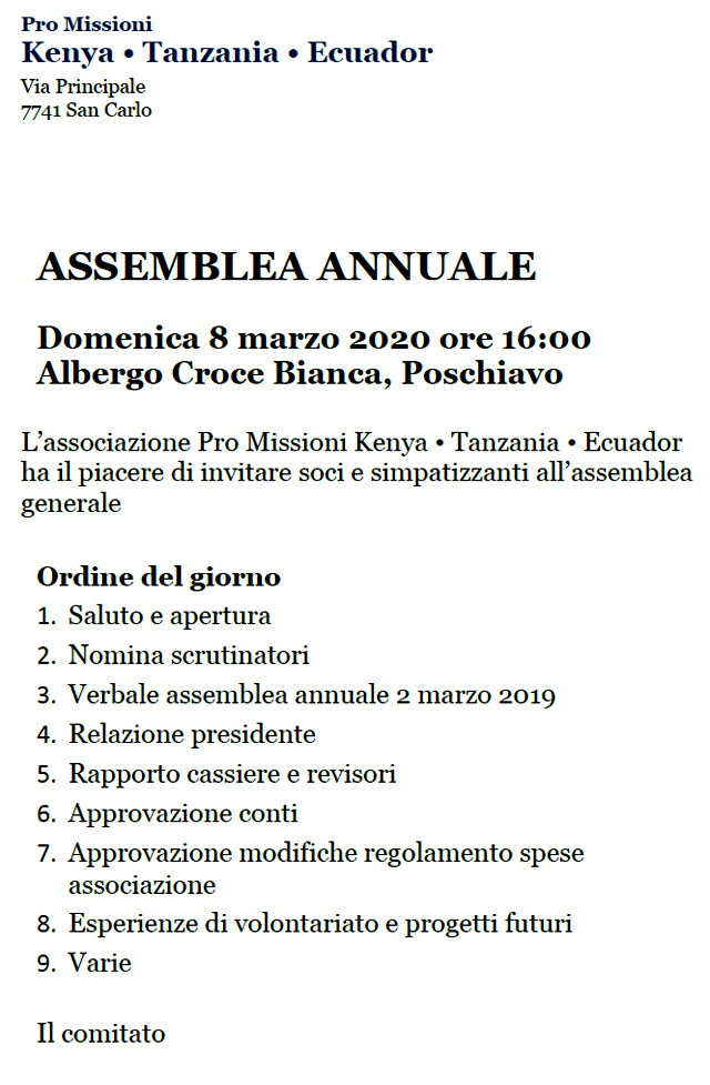 Alle 16, presso l’Albergo Croce Bianca, l’assemblea annuale Pro Missioni Kenya, Tanzania, Ecuador.