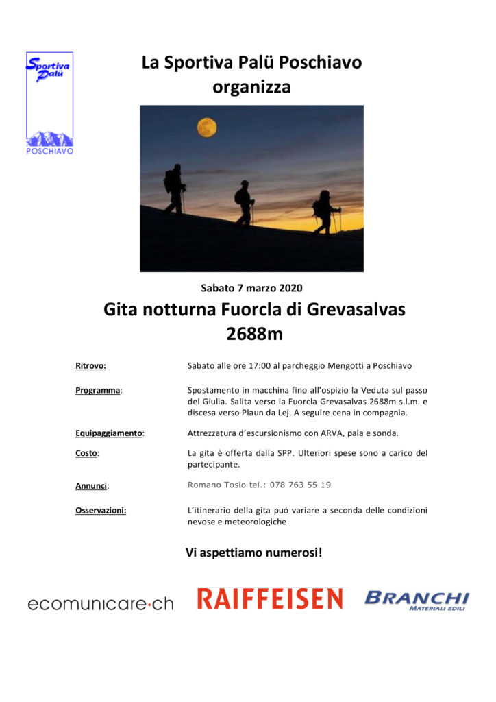 Con partenza dal parcheggio Mengotti di Poschiavo alle ore 17, il via alla gita notturna Fuorcla di Grevasalvas della SPP.