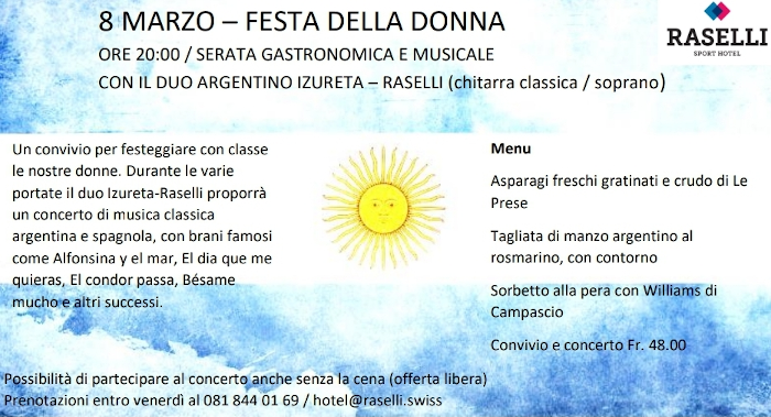 Alle 20, presso il Raselli Sport Hotel di Le Prese, serata enogastronomica e musicale per la festa della donna.