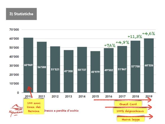 Il presidente di Valposchiavo turismo, Marcello Gervasi, ha presentato le cifre sull’ottimo andamento turistico nel 2019. Oltre alla nota allietante sul numero annuo dei pernottamenti in albergo, che ha quasi riconquistato quota 60’000 – come nel 2010, l’anno del giubileo della Ferrovia del Bernina –, con 11’274 pernottamenti, il mese di agosto del 2019 ha segnato un nuovo record mensile da quando si tengono le statistiche. Gervasi ha poi parlato della partecipazione di Valposchiavo Turismo a diverse fiere dedicate al turismo e dell’aumento esponenziale di visualizzazioni del sito internet (110’344). Le campagne pubblicitarie promosse con Google AdWords avrebbero inoltre generato entrate pari a CHF 168’000.-. Nel 2019 è anche stato inaugurato il nuovo sportello presso la biglietteria completamente rinnovata della stazione ferroviaria di Poschiavo, nonché la «camera obscura» presso il punto d’appoggio dell’Ufficio tecnico sul Passo del Bernina. Per il 2020 Gervasi prospetta infine un incisivo calo dei pernottamenti a causa del coronavirus; un calo che non riguarderà però solo la nostra regione e che sarà verosimilmente globale. Alla fine della sua relazione Gervasi è stato ringraziato dal presidente Misani, che lo ha ringraziato per il suo costante impegno e il dinamismo profuso in seno al comitato di ACV e alla testa di «Valposchiavo Turismo», ed è stato salutato dai soci presenti con un caloroso applauso.