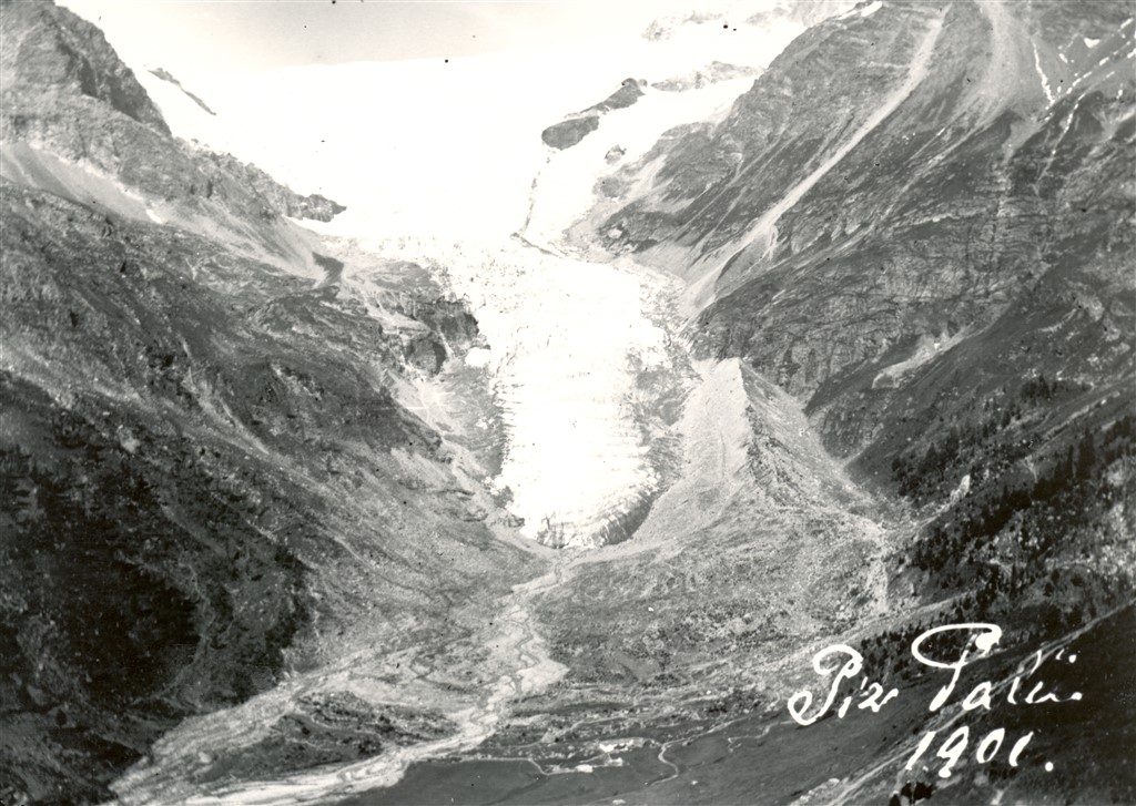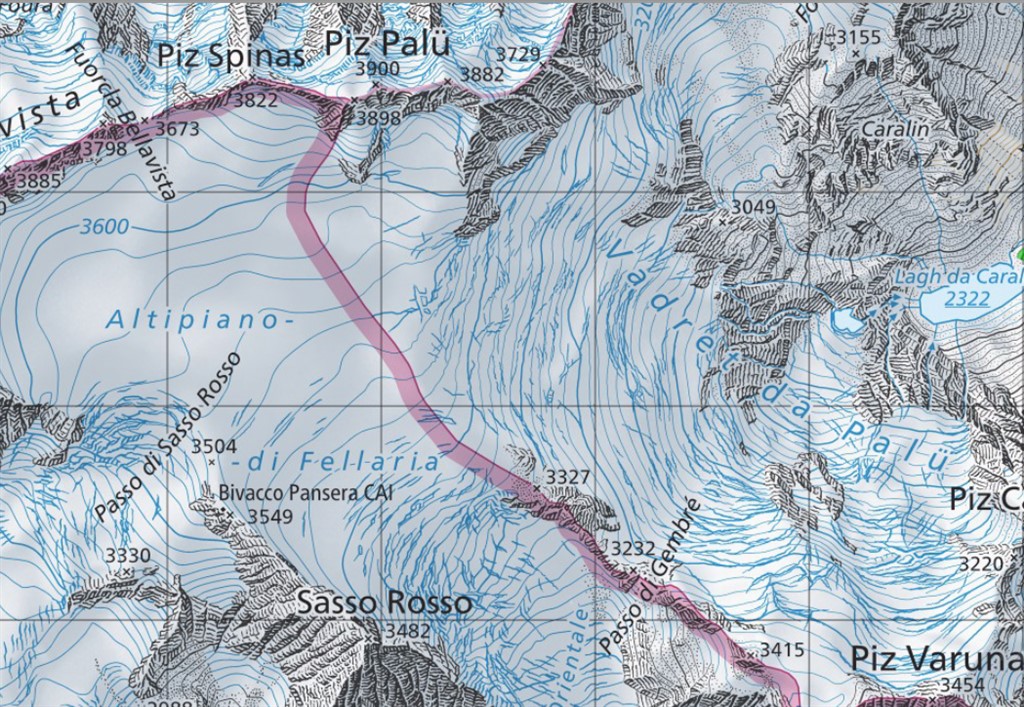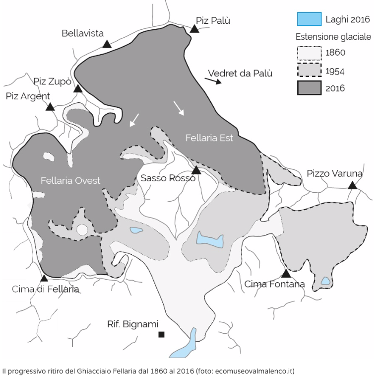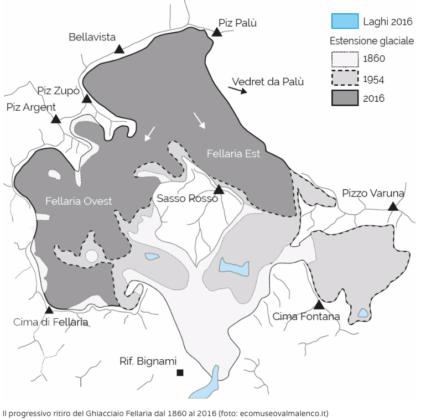 “Vediamole insieme. Qui ecco, sulle pendici del Caral a Li Mandri, si è formata una zona franosa molto evidente. Per quanto riguarda il ghiacciaio come si vede, si è man mano ritirato lasciando oltre il Lagh da Palü, il Lagh da Caralin, formatosi recentemente e dunque assente nelle carte più datate e presente invece in quelle più recenti. E risalendo ancora verso la fronte del ghiacciaio si può vedere la formazione di un altro laghetto, a cui prima o poi dovremmo dare un nome”.