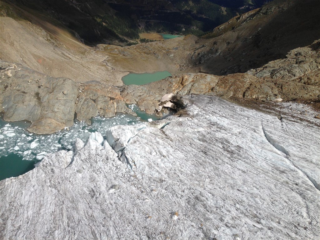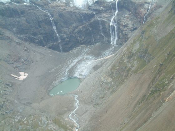 La fronte è a contatto con il Lago di Fellaria e questo peggiora ulteriormente le cose visto che l’acqua tende a scalzare la base della falesia di ghiaccio producendo frequenti piccoli crolli che formano, diciamo così, pittoreschi iceberg. Ghiacciai e laghi però non vanno molto d’accordo ed infatti la presenza di un corpo d’acqua così grande e (probabilmente) profondo accelera la disgregazione del ghiacciaio favorendo il distacco di porzioni di ghiaccio. A questi processi naturali del sistema ghiacciaio, compresa una parte di fusione e perdita di spessore in questa zona di bassa quota, si sovrappone, in questa fase storica, una fusione superficiale di carattere eccezionale dovuta alle elevatissime temperature estive che raggiungiamo quasi ogni estate a causa del riscaldamento globale antropogenico. Sulla porzione del ghiacciaio ripresa in queste immagini si parla di – 6.45 m di ghiaccio, l’altezza di una villetta a 2 piani, in soli 4 mesi da giugno a ottobre 2019.