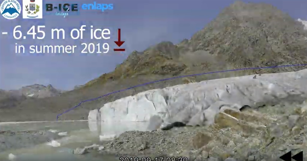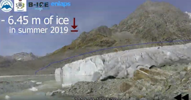 “Siamo alla fronte orientale del ghiacciaio di Fellaria-Palù (gruppo del Bernina) uno dei maggiori delle Alpi meridionali. La fotocamera installata il 16 giugno ha ripreso l’evoluzione della fronte scattando oltre 13000 immagini, una ogni 15’, fino al 17 ottobre. Dal filmato è evidente come il ghiacciaio perda spessore principalmente fra la fine di giugno ed il mese di luglio, quando alle giornate lunghissime si sono sommate temperature estremamente elevate. La terza estate più calda nelle Alpi centrali da metà Ottocento!
