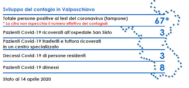 Il numero delle persone contagiate in Valposchiavo è in costante aumento. L’efficacia delle misure di contenimento indica un moderato rallentamento della diffusione a livello cantonale. È però essenziale perseverare nel rispetto delle regole e perciò si racco-manda nuovamente a tutti di rimanere a casa.