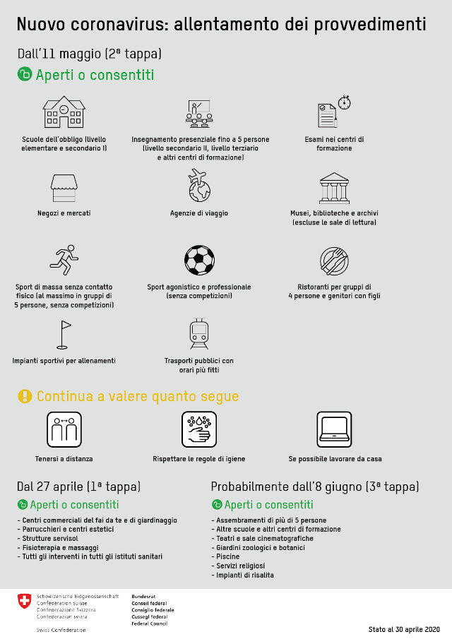 Anche se il Consiglio federale allenta ora i provvedimenti, a condizione tuttavia che siano osservati in modo scrupoloso i piani di protezione, il nuovo coronavirus è ancora tra di noi e dovremo abituarci all’idea che lo resterà ancora per molto tempo. Per ridurre ilrischio di una nuova impennata dei contagi dobbiamo continuare a rispettare scrupolosamente le regole d’igiene e di comportamento e a rinunciare ai contatti non strettamente necessari.