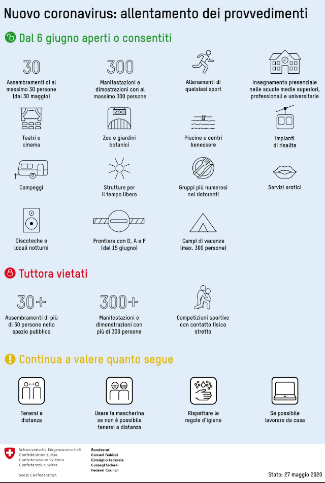 Dal 6 giugno il Consiglio federale allenta ulteriori provvedimenti. A partire da quella data si potranno nuovamente svolgere le attività del tempo libero, ricreative e sportive, a condizione che siano tenuti elenchi dei presenti e siano allestiti piani di protezione e rispettate le regole di igiene e di comportamento.