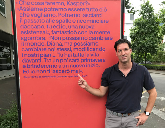 Tra i 45 autori presenti, il mesolcinese Gerry Mottis, con un estratto dal suo ultimo romanzo “Terra bruciata. Le streghe, il boia e il diavolo” (Capelli editore), con un dialogo tra il Ministro di Giustizia e una giovane suora riscattata al proprio destino di clausura. In tre copie gigantografiche, i cartelloni di Mottis possono essere visti in tre luoghi distinti per la città: presso il Lido di Lugano, in Via Beltramina e di fronte all’Ospedale Civico. Tra gli altri autori spiccano Andrea Fazioli, Anna Felder, Alberto Nessi, Giorgio Orelli, Daniele Dell’Agnola e Daniele Finzi Pasca. La mostra di opere a cielo aperto sarà visibile per tutta l’estate.