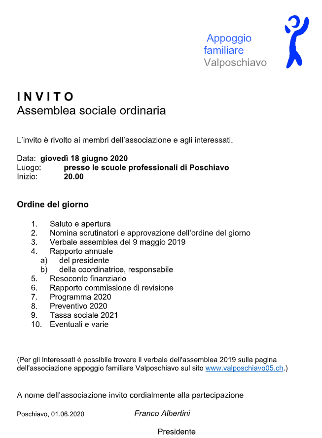 Senza categoria Invito Assemblea Appoggio familiare Valposchiavo Giovedì 18 giugno Di Appoggio Familiare Valposchiavo - 4 Giugno 2020 0 161