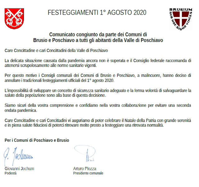 Senza categoria Annullati i festeggiamenti del 1° agosto A Brusio e Poschiavo Di Comunicato congiunto - 10 Luglio 2020 0 325