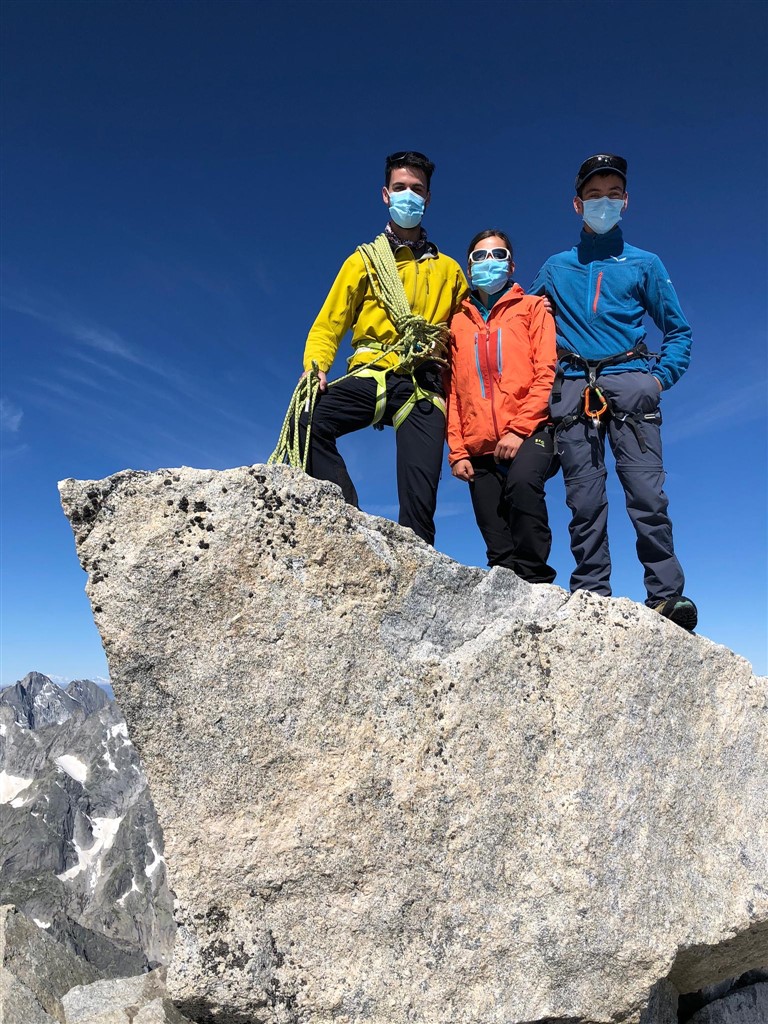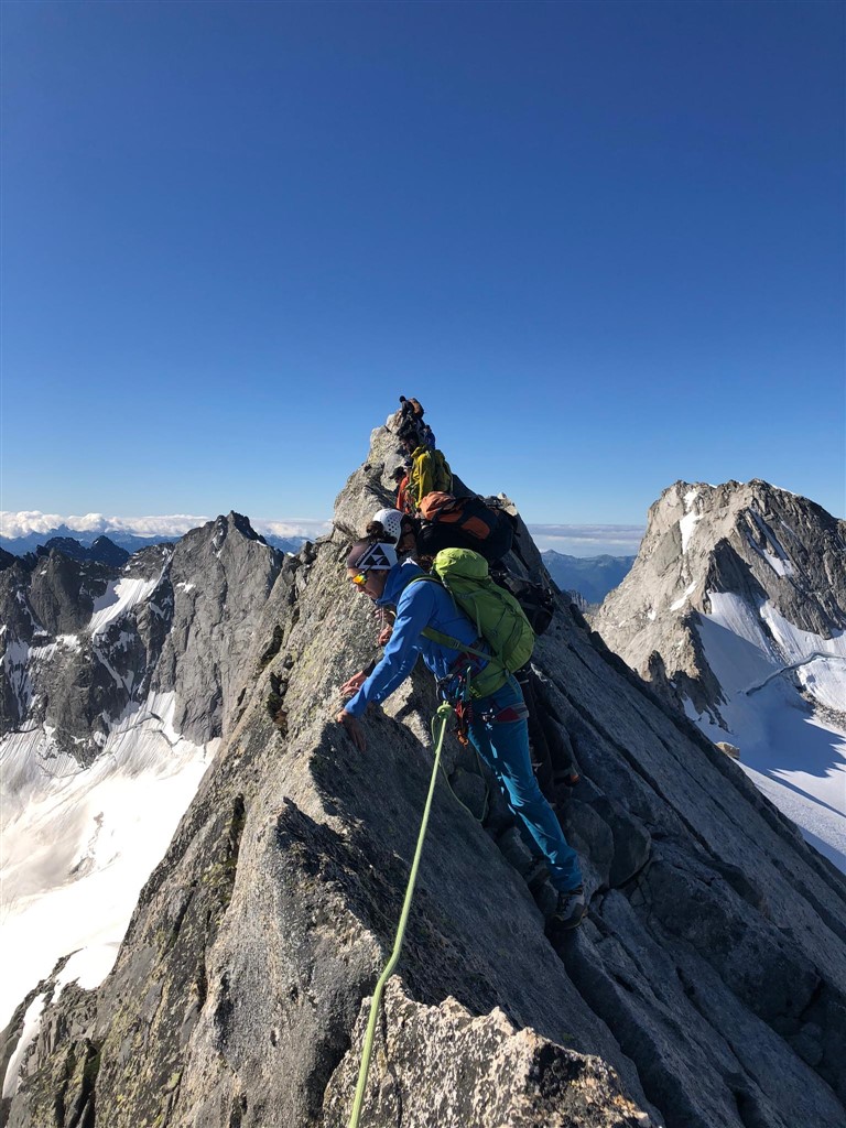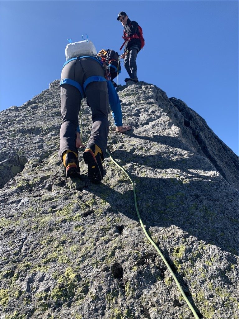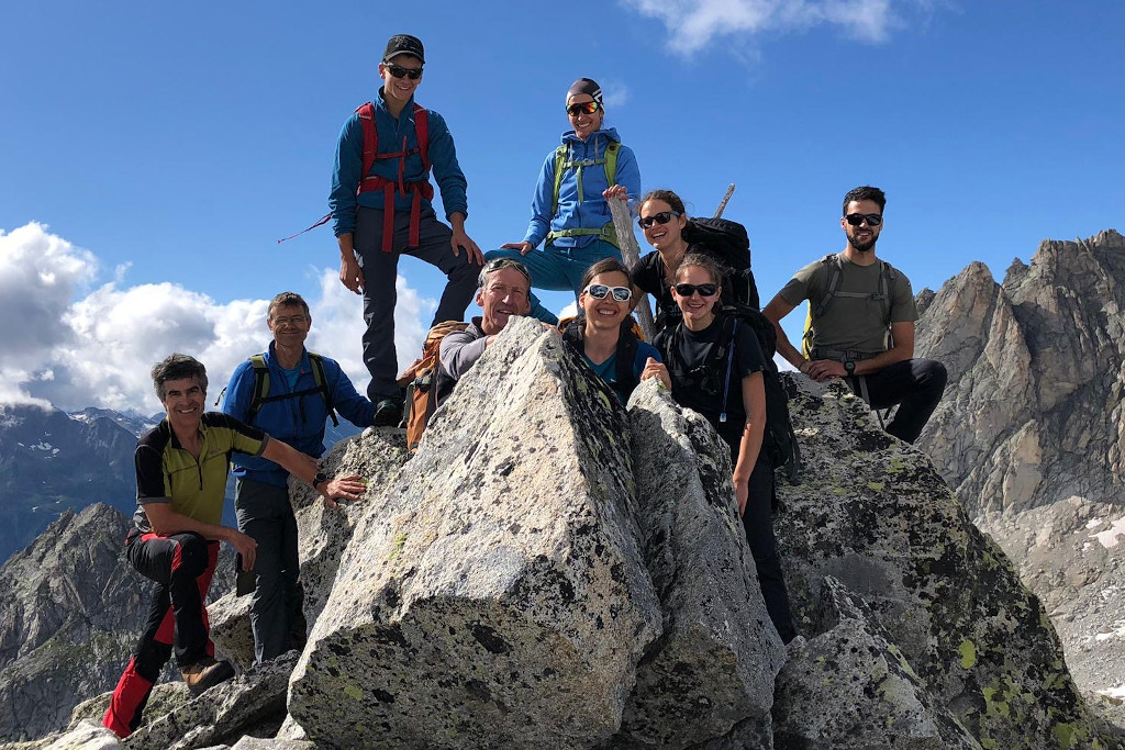 Proprio sulla Cima dal Cantun (3354 m) ci siamo andati il giorno dopo partendo alle prime luci, aggirando la montagna, che si allarga fino alla Punta da l’Albigna, passando a lato del lago artificiale, salendo un pendìo alquanto ripido e attraversando in cordata un ghiacciaio largo quanto lungo, con i ramponi che tenevano bene nella neve ancora ben gelata. Arrivati sulla sella siamo stati baciati da un sole bel caldo e da una vista meravigliosa. Mancava solo lo spigolo e la cresta di un centinaio di metri, in due punti abbastanza impegnativa e soprattutto molto esposta. Ce l’abbiamo fatta tutti senza tensioni e senza molti problemi, grazie alla proverbiale calma e professionalità dell’ottima guida Moreno Demonti e dei bravi monitori Simone Beti e Marco Heis. Eravamo in un bel gruppo di dieci su tre cordate, quattro donne giovani ben allenate e alcuni giovani con grande esperienza in montagna, oltre ad alcuni “over 60” come il sottoscritto. La vista dalla cima dal Cantun era spettacolare: sotto l’esteso Vadret del Forno, davanti la parete nord della Cima di Rosso e dietro il Disgrazia, e si vedevano persino le catene vallesane, ben visibile lo Strahlhorn e il Cervino.
