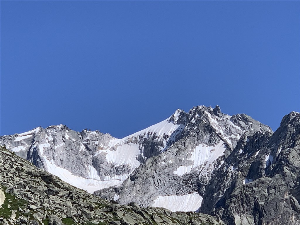 Verso le 3 del pomeriggio è cessato di povere e ci siamo avviati di buon passo verso il Piz Casnil. E’ stata una bella salita di poche ore in un paesaggio fantastico, con il ghiacciaio e la parete nord della maestosa Cima dal Cantun davanti a noi. Più in alto la vista sul gruppo Sciora e quello della Bondasca con il tristemente famoso Cengalo e il Badile era da mozzafiato. La discesa è stata veloce, anche perché i più abili scivolavano sui pendii innevati come se avessero gli sci. Si sono fermati solo per ammirare alcuni stambecchi che brucavano tranquilli la prima erba, a anche per noi ci aspettava la cena.