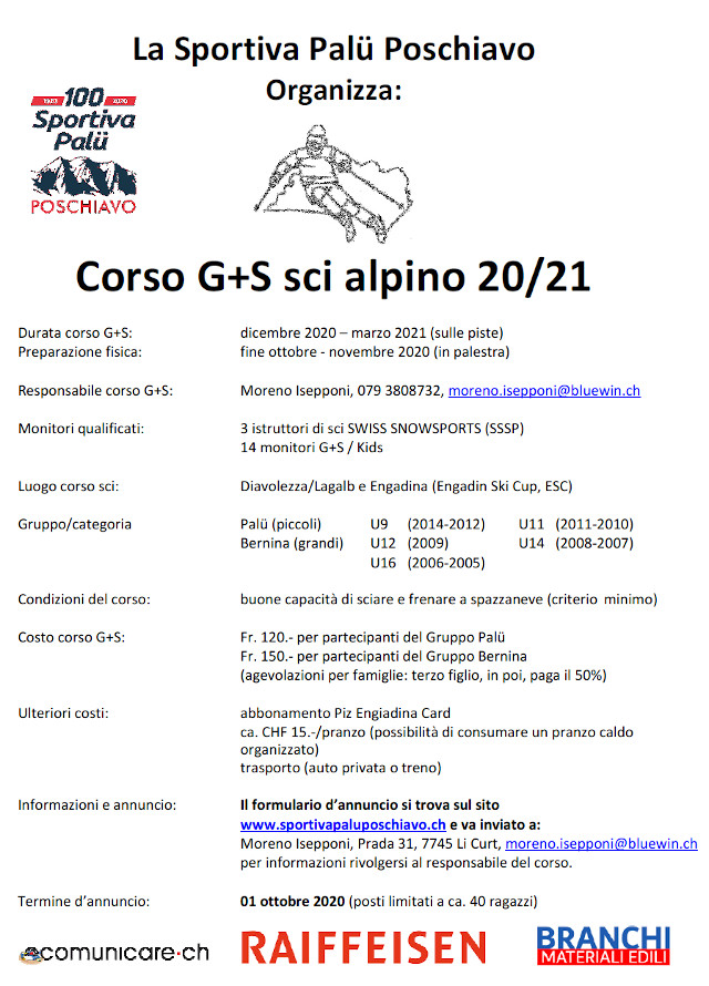 Senza categoria Corso G+S sci alpino 20/21 Scarica qui il formulario Di Sportiva Palü Poschiavo - 19 Agosto 2020 0 161 Per scaricare il formulario d’annuncio clicca qui.