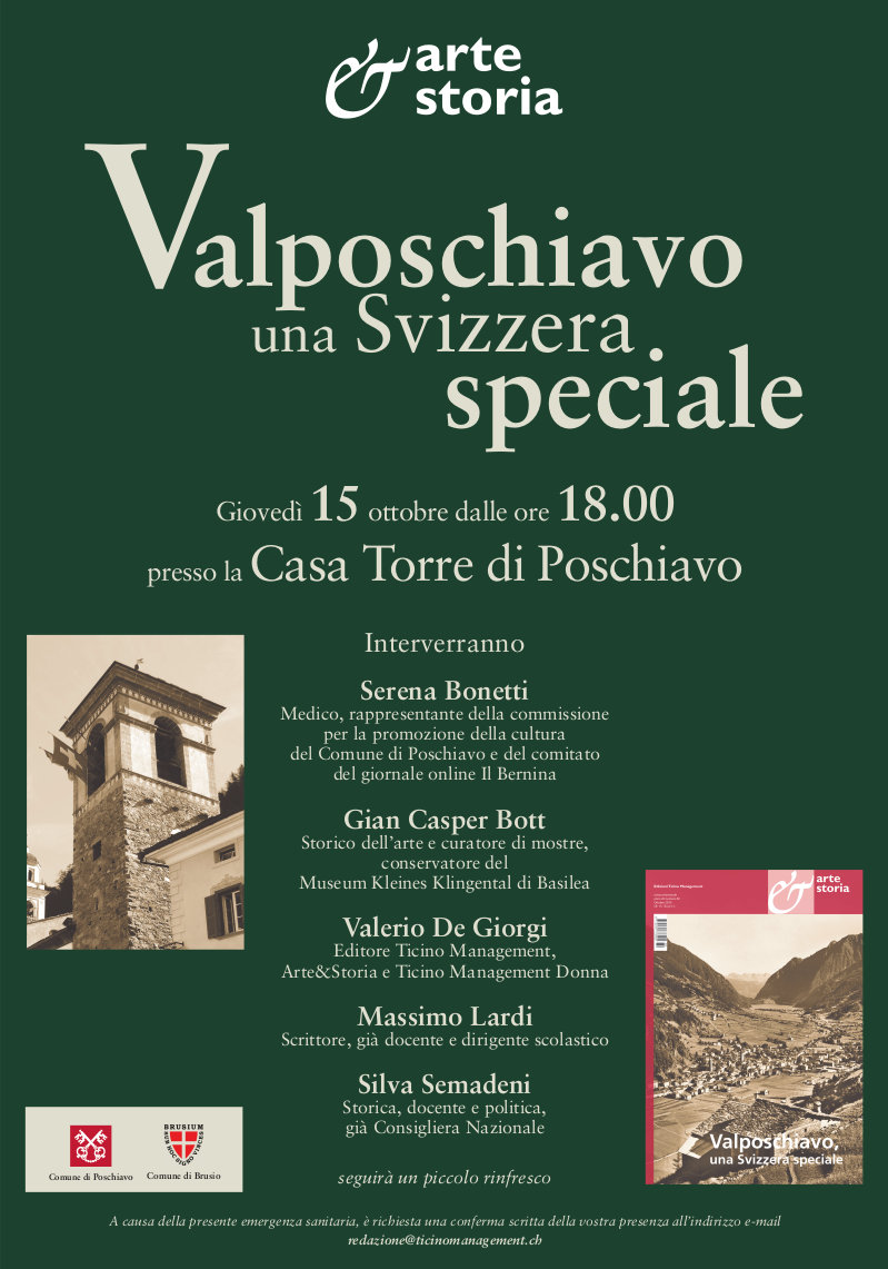 Diciotto autori per la Valposchiavo. La casa editrice Ticino Management di Lugano (ben conosciuta per il mensile di economia e finanza Ticino Management e per quartely femminile Ticino Management Donna) pubblica un numero speciale del magazine culturale Arte & Storia dedicato alla valle del Grigione Italiano, alla sua storia, alla sua arte e alla sua cultura, con il patrocinio dei comuni di Brusio e Poschiavo.