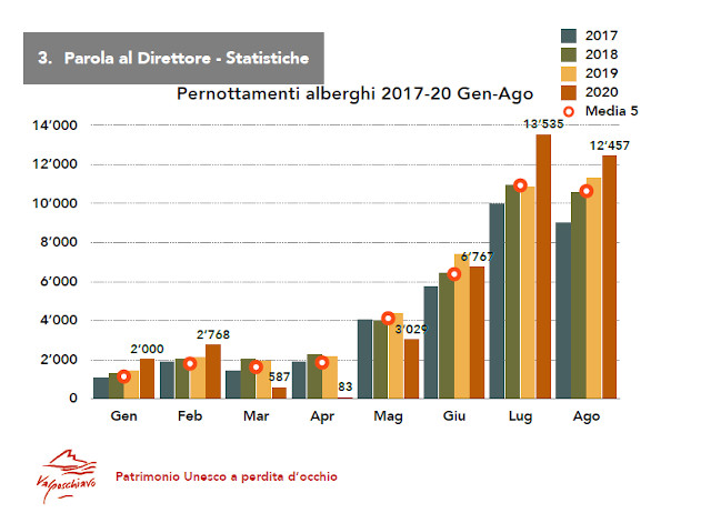 Le ottime cifre ufficiali fino ad agosto sembrano essere confermate dalle prime stime non ufficiali del mese di settembre in Valposchiavo, si parla di più di 10’000 pernottamenti (e mancano ancora all’appello alcune cifre), che già solo con questo parziale segnerebbero un +23% rispetto al settembre 2019. Sembra quindi che a fine anno la Valposchiavo sarà una delle poche mete turistiche a livello mondiale ad aver incrementato i suoi pernottamenti rispetto all’anno precedente.