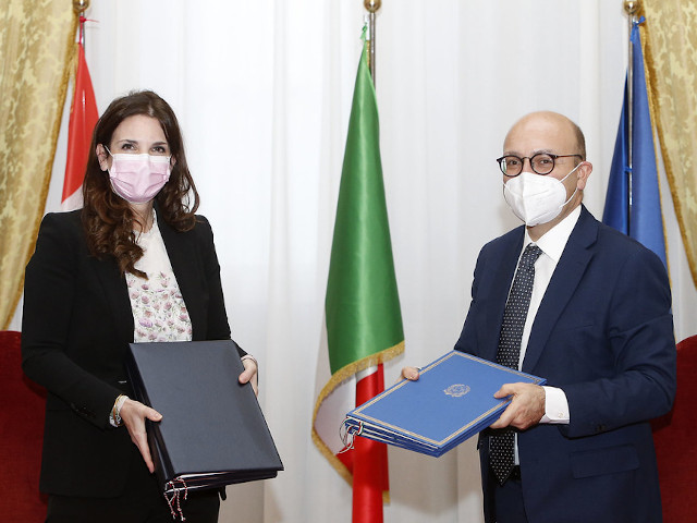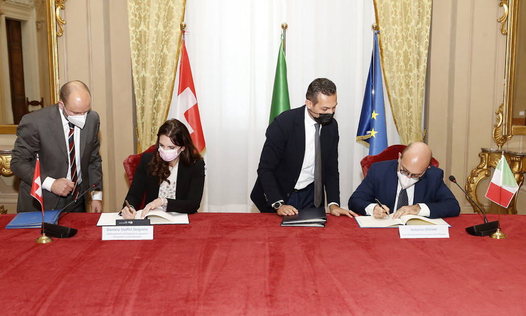 Nelle due foto vediamo la firma e poi lo scambio dei documenti da parte della segretaria di Stato per le questioni finanziarie internazionali, Daniela Stoffel Delprete, e del viceministro italiano dell’Economia e delle Finanze, Antonio Misiani.